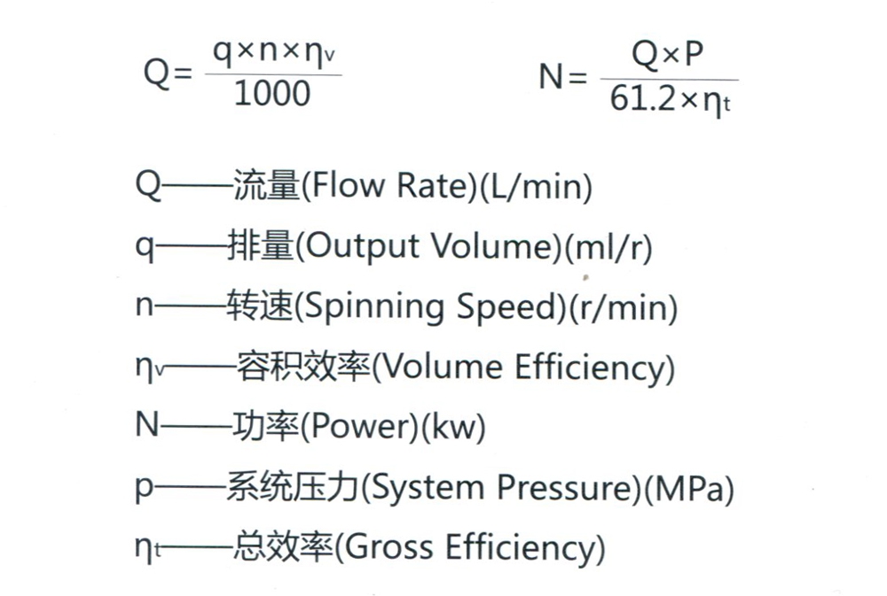 用戶應(yīng)根據(jù)液壓系統(tǒng)實(shí)際工況(壓力、流量)和轉(zhuǎn)速,計(jì)算岀泵的排量,選擇好型號即可算出泵需要的功率隨后確定電機(jī)或其它的動力源。