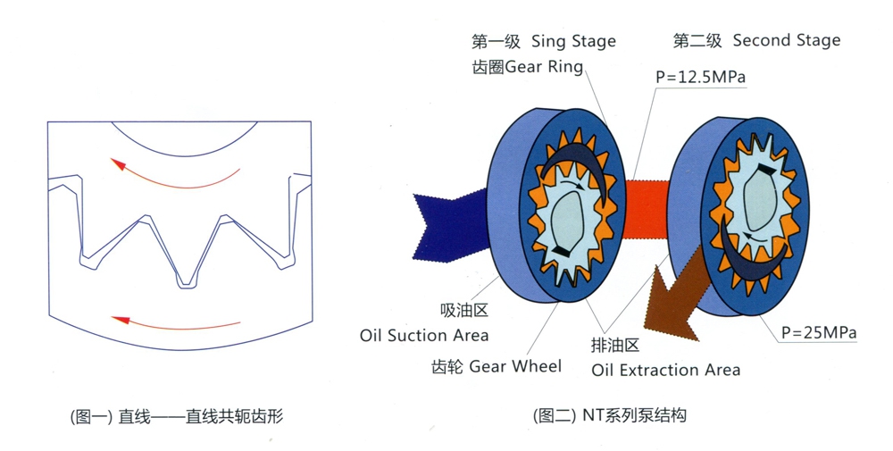 NT系列泵的工作原理同漸開線內(nèi)嚙合齒輪泵一樣,由齒輪帶動齒圈旋轉(zhuǎn),在旋轉(zhuǎn)過程中吸油腔容積由小變大產(chǎn)生真空而吸油,排油腔容積由大變小擠壓油液而排油。NT系列泵的最大優(yōu)點(diǎn)是采用直線共軛線的齒形(見圖一),并按無困油設(shè)計(jì),從而大大降低了泵的噪音和壓力脈動,工作時壓力油使滑動元件得到強(qiáng)制潤滑,磨損極少,提高了泵的使用壽命。